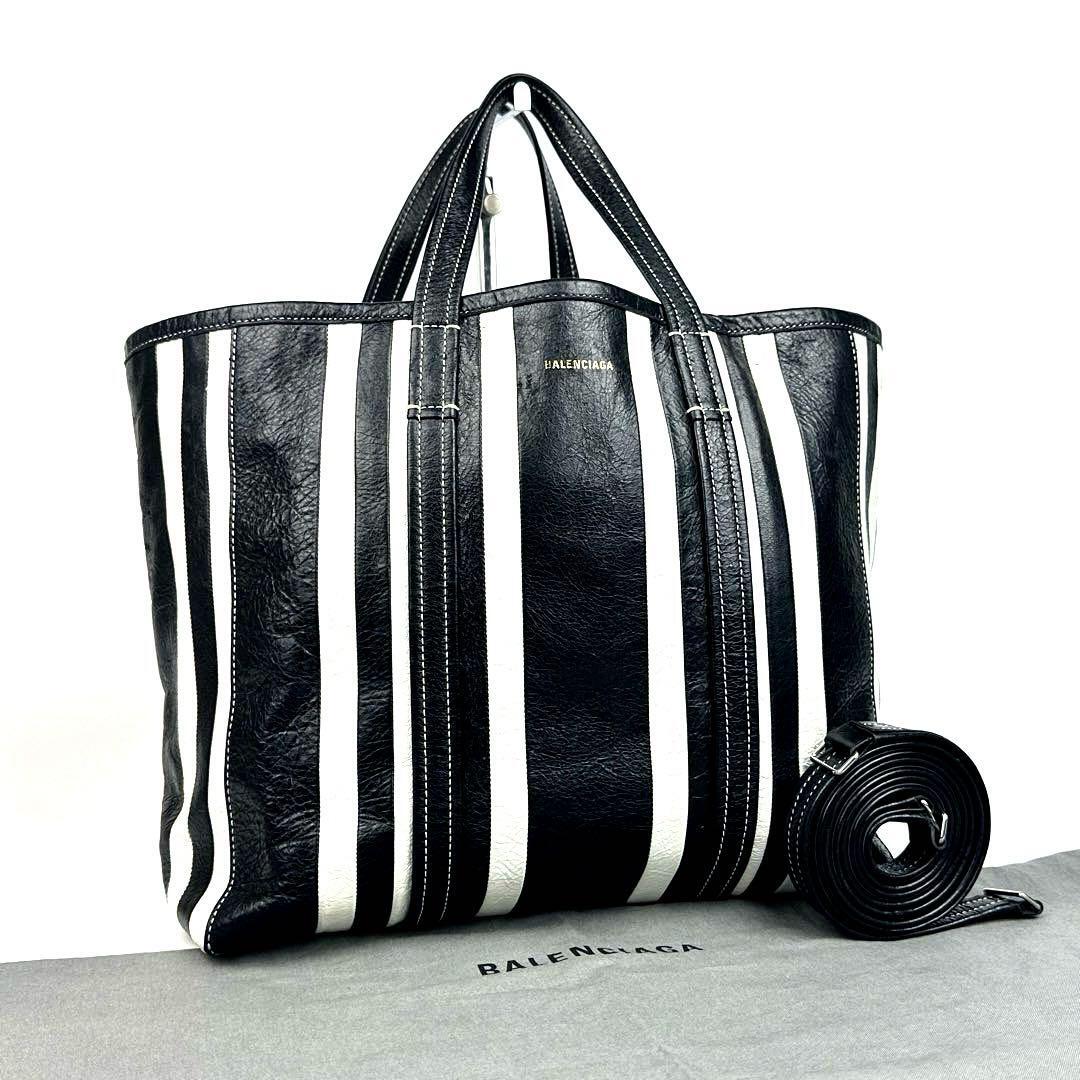 > 美品■BALENCIAGA バレンシアガ トートバッグ 2way バルベス ストライプ 総柄 シワ加工 ショルダーバッグ レザー 黒 ブラック 白 ホワイト