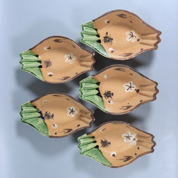 - 219■岸本謙仁 「鳴海織部 舟形向付 五客」 共箱 栞 美濃の里 日本工芸会正会員・認定 茶道具 煎茶道具