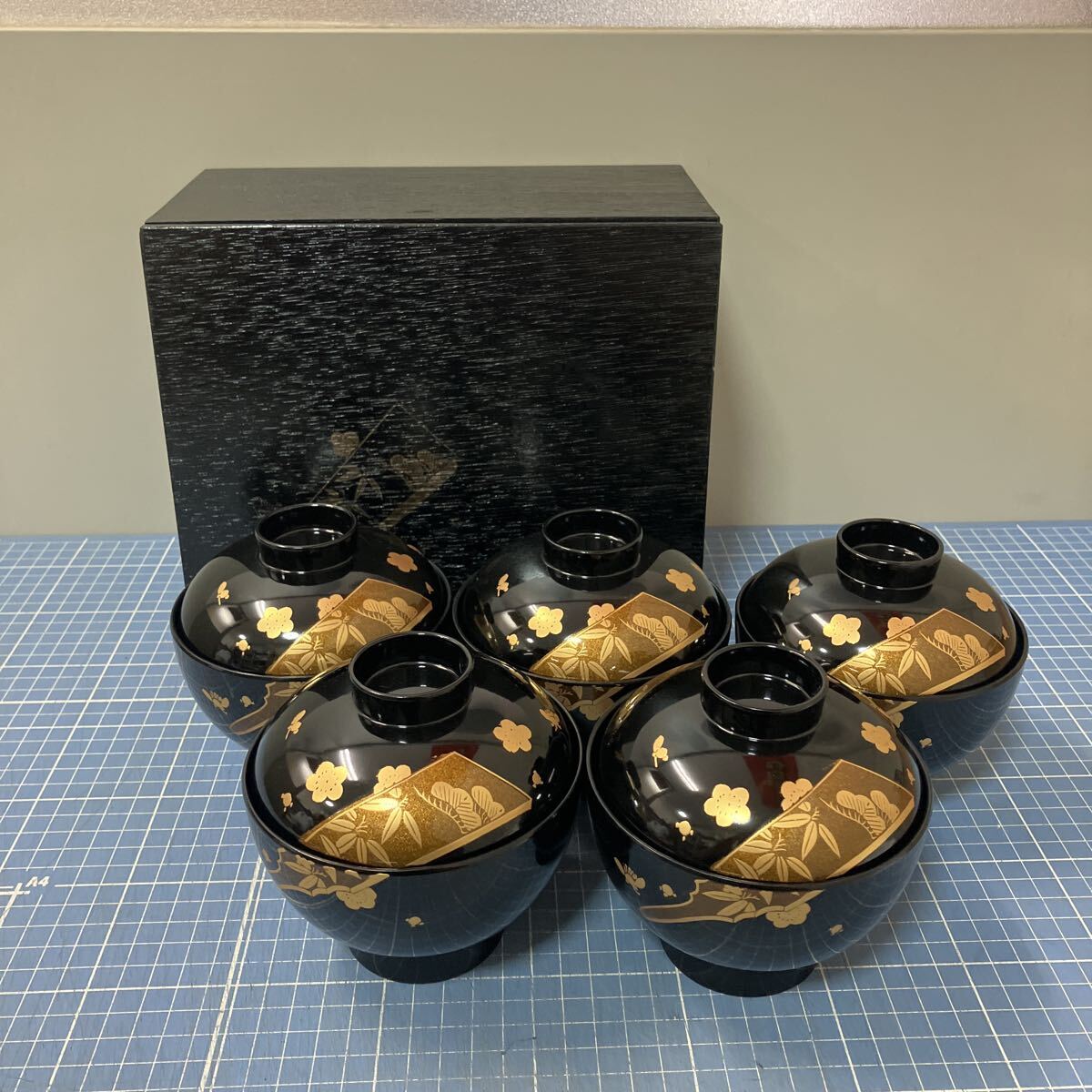 - 【吸物椀 蓋付御吸物椀 5客セット】和食器 汁椀 お椀 黒千鳥吸物椀羽子板 木箱入り【B5-1①】0919
