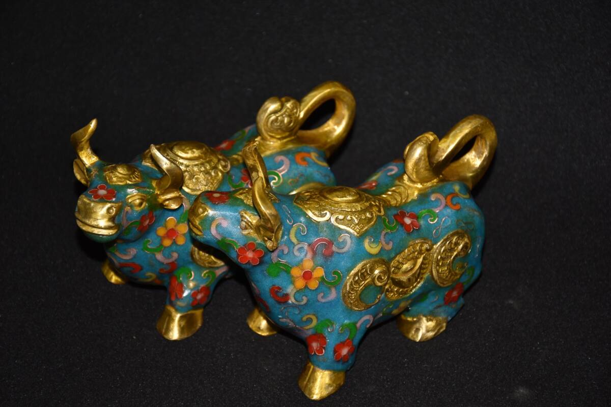 - 『館蔵珍品 銅製 景泰藍 琺瑯彩 發財牛一對 置物 賞物』稀少珍蔵品 古賞物 貴重物品 収蔵品 中国古美術 時代物 古董品