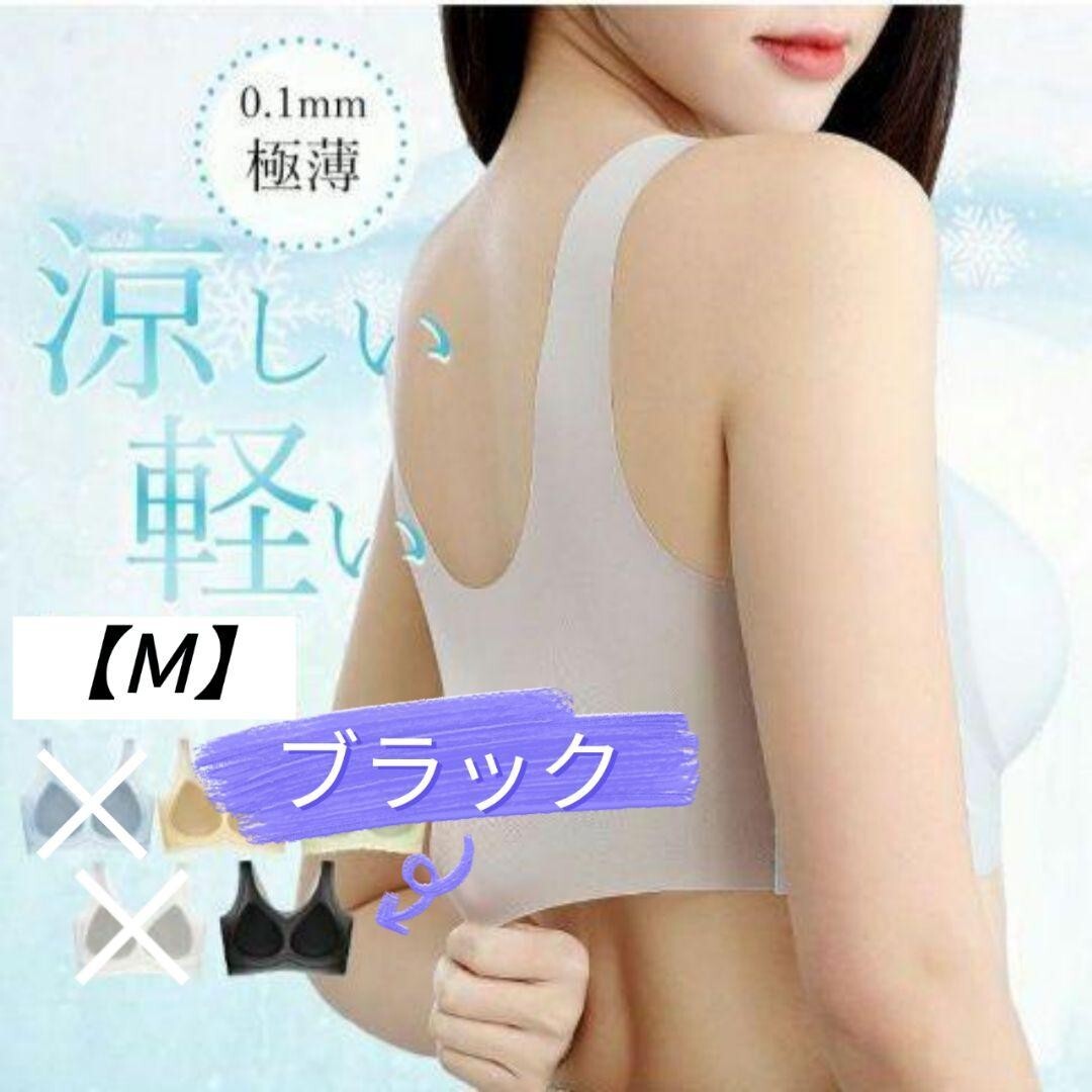- 涼感ブラ ノンワイヤー ブラジャー【M】シームレス ハーフトップ 接触冷感 ブラック スポーツ 無縫製 パッド入り 夏 クール