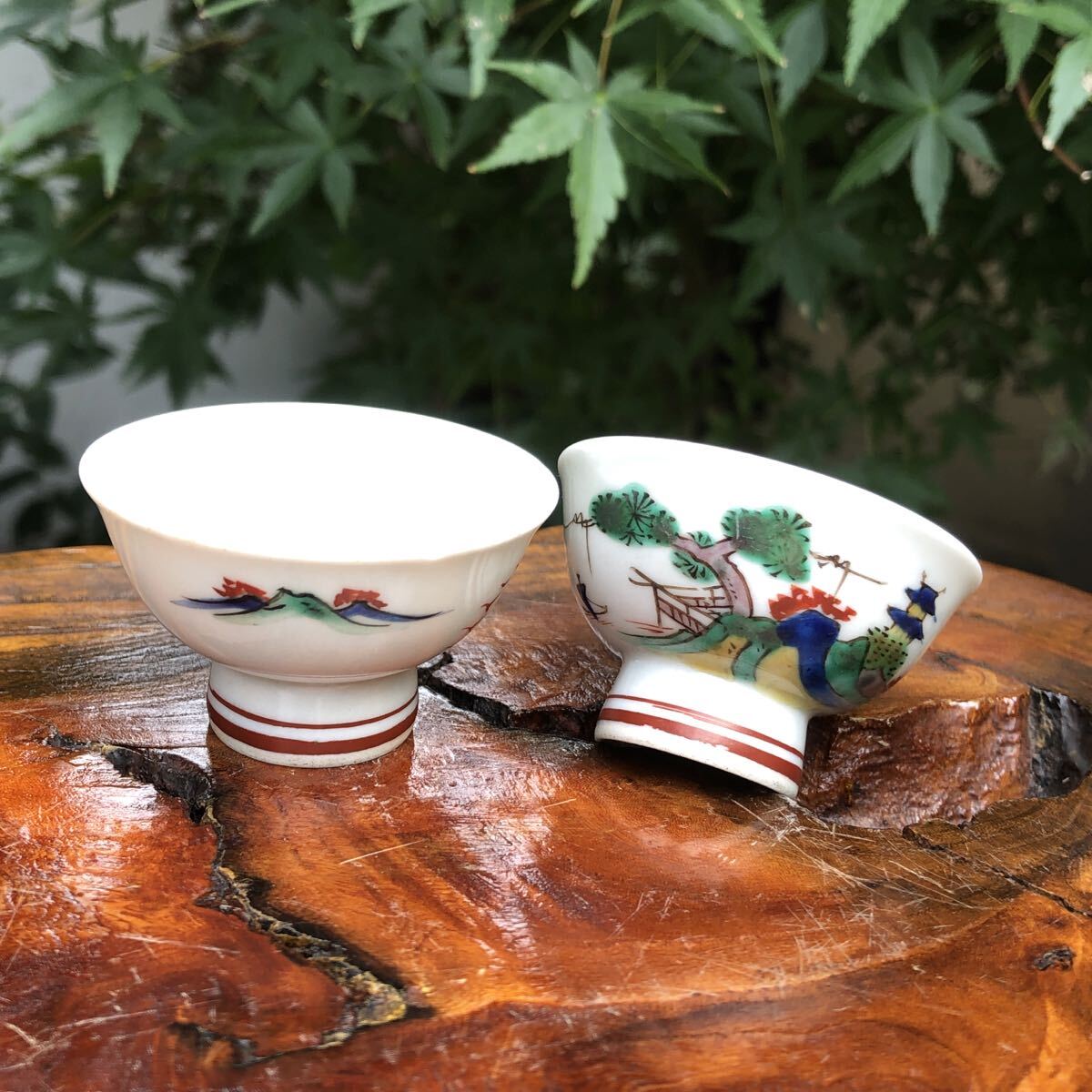 - 九谷焼 色絵 猪口★ビンテージ 楼閣 鳥 遠山 船 盃 杯 酒器 晩酌 ぐい呑 数奇 古民家 粋 アンティーク 風雅 侘び寂び 吉祥 縁起 伝統工芸
