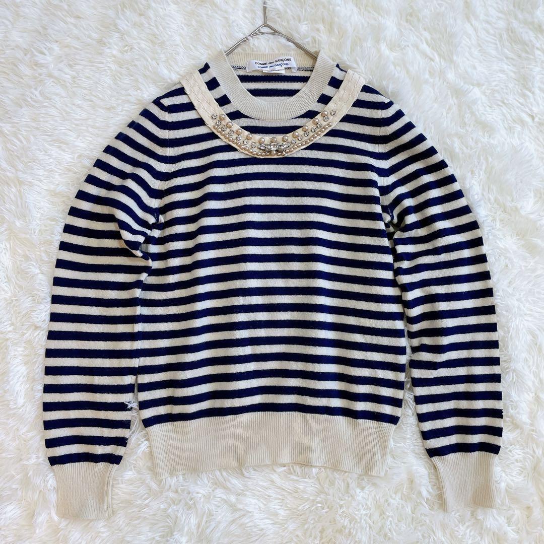 - COMME des GARONS コムコム コムデギャルソン ボーダーニット ビジュー飾り付き SSサイズ クルーネック 長袖 レディース