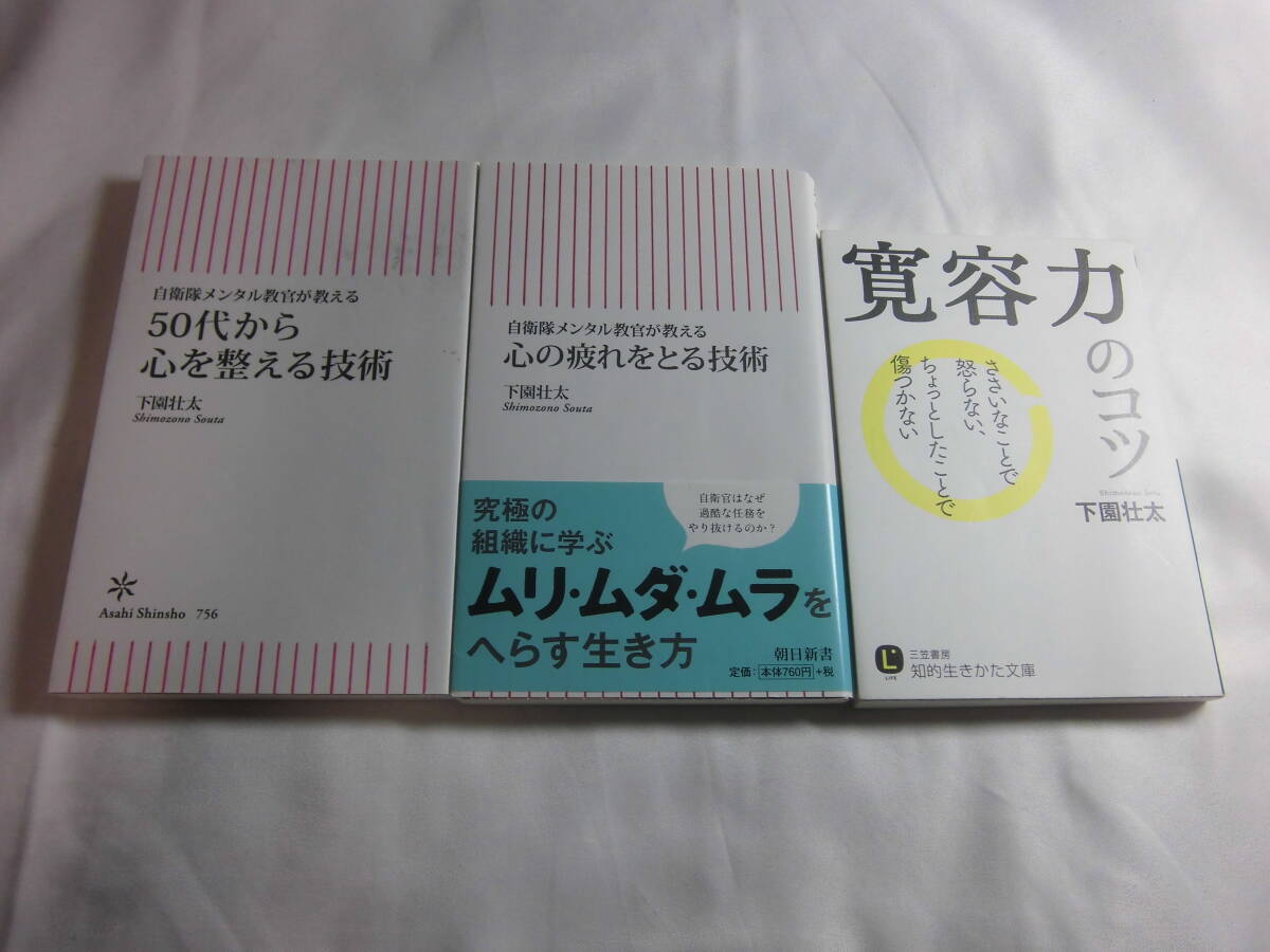 「自衛隊メンタル教官が教える 心の疲れをとる技術」下園 壮太 (著) 2013年初版2016年6刷定価760円+税。と「自衛隊メンタル教官が教える 50代から心を整える技術」下園 壮太 (著) 2020年初版定価790円+税。と「寛容力のコツ: ささいなことで怒らない、ちょっとしたことで傷つかない 」 下園 壮太 (著)2017年初版2023年3刷定価630円+税。の計3冊セット。