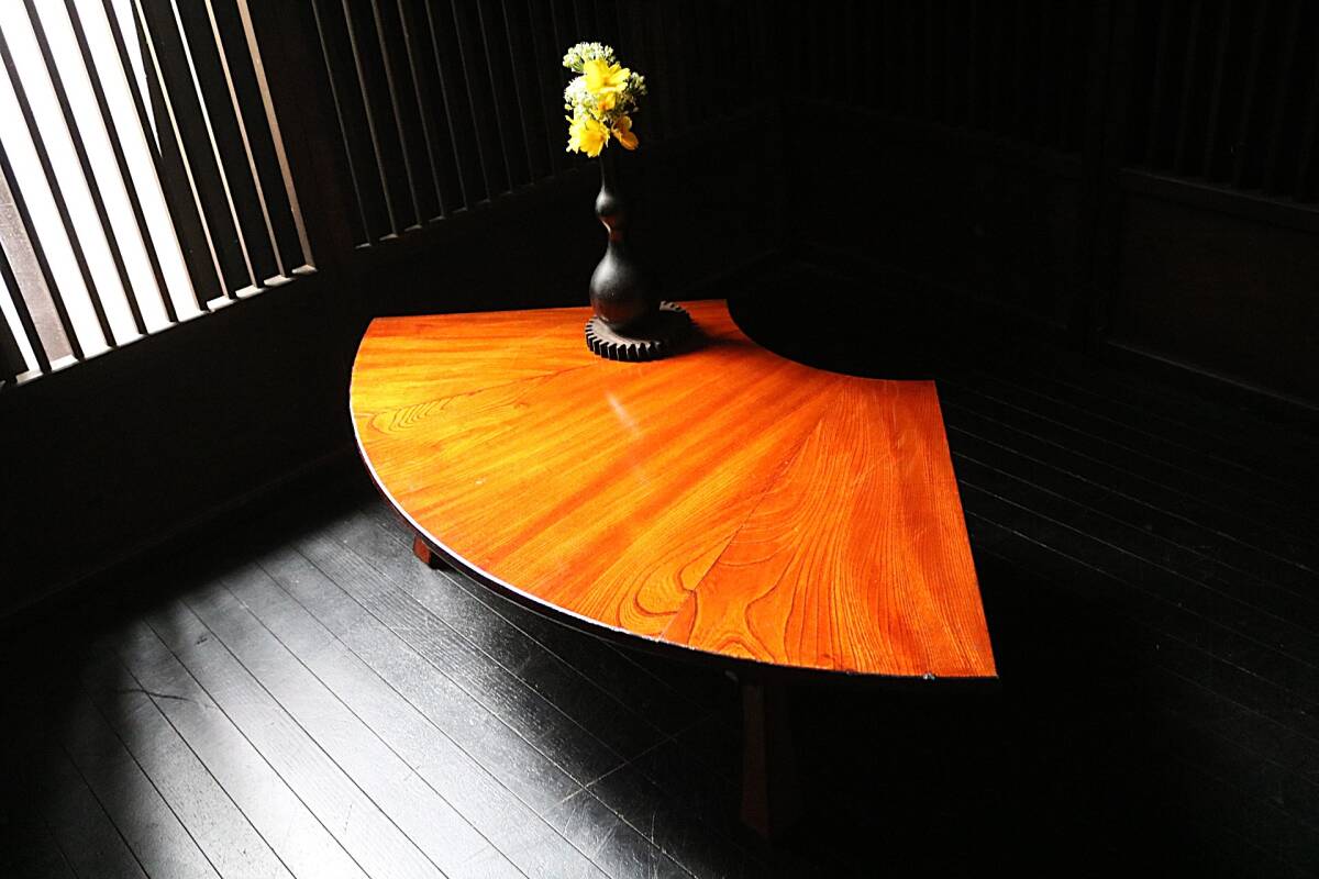 > 【伊董】C129.アンティーク!昭和レトロ!変わり型!古いテーブル山形県庄内地方扇面型(扇子型)ちゃぶ台総欅昭和 #卓袱台 #和モダン