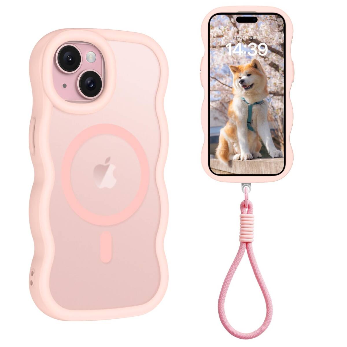 > ケース magsafe対応 手首ストラップ付き iphone15 ウェーブ 波状エッジ 耐衝撃 落下防止 iphone 15ケース