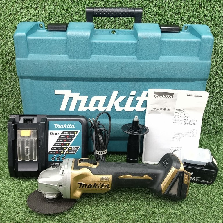 > 中古品 makita マキタ 18V 100mm コードレス ディスクグラインダ ゴールド + バッテリー 1個 + 充電器 + ケース セット GA404DSP1