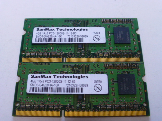 - ノートパソコン用メモリ 両面チップ SanMax SK hynixチップ 1.5V DDR3-1600 PC3-12800S 4GBx2枚 合計8GB 起動確認済みです①