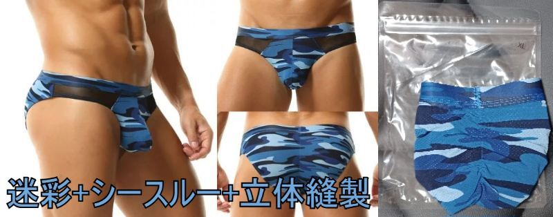 - 【特価:10/10迄】品薄/視線を惹きつけるカッコ良さ!! 迷彩柄シースルービキニブリーフ(XL)ブルー