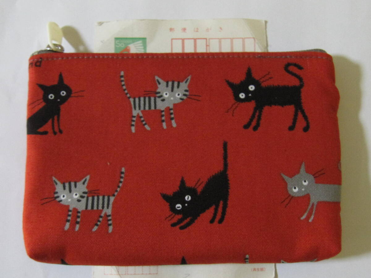 - 手作り 大 ポーチ 濃赤 黒猫 トラ猫 ねこ 動物 模様 格安 ハンドメイド 秋 手芸 財布 小物 充電器 眼鏡 男女 兼用 可愛い アニマル 綿 幅広