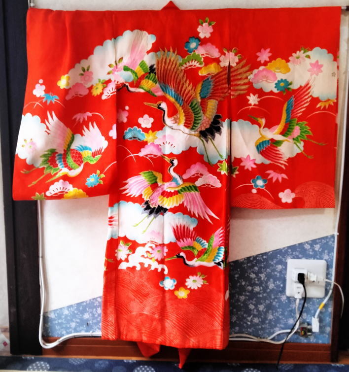 > 50年前 着物【女児】当時物 刺繍 鶴 お宮参り お正月 初節句 昭和レトロ オレンジ系 和服 女の子 初着 祝着