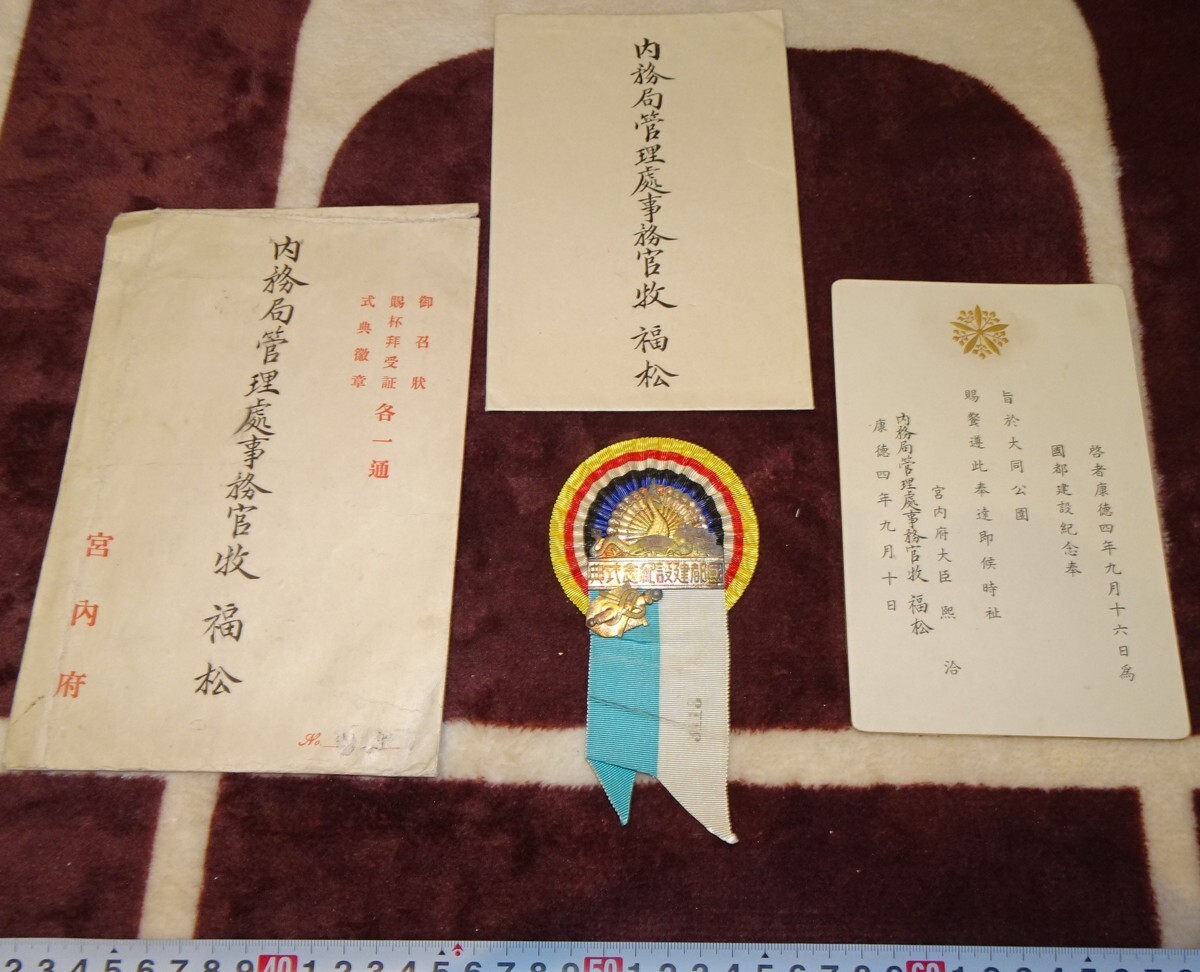 > rarebookkyoto m241 満洲 帝国 大同公園 国都建設記念大典 御召状と式典徽章 1938 年 宮内庁 新京 満鉄 大連
