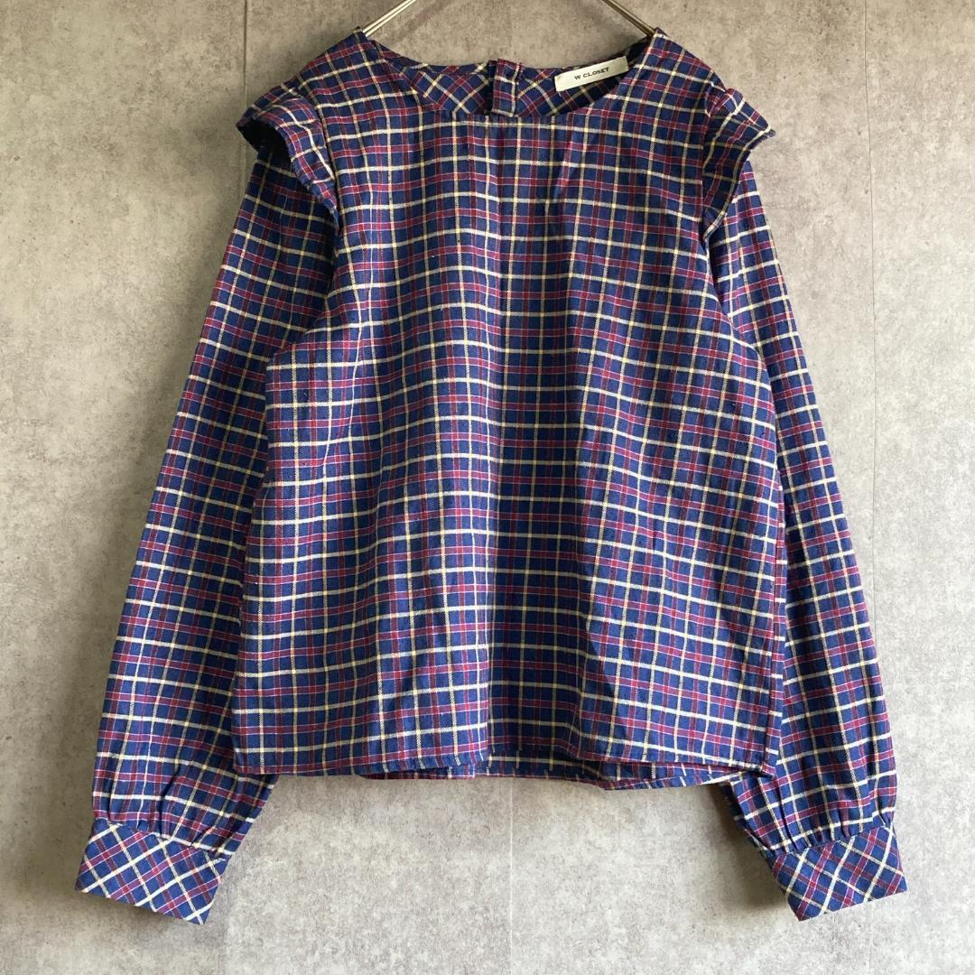 - 【美品】ダブルクローゼット(F)Lノーカラーブラウス*チェック柄*長袖*後ボタン