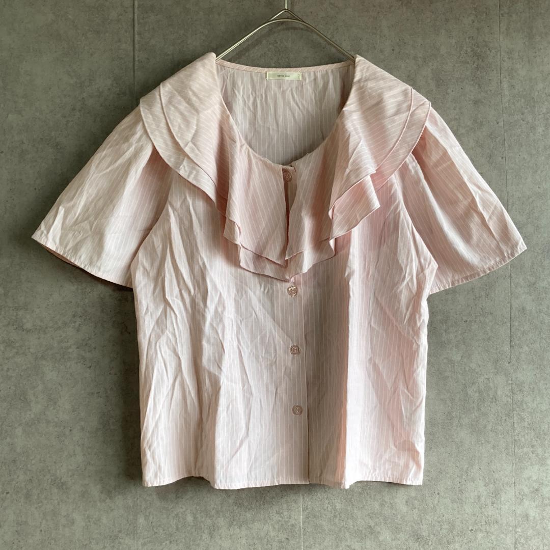 - アプレジュール(F)ストライプ半袖シャツ*トップス*ラッフルカラー*フェミニン