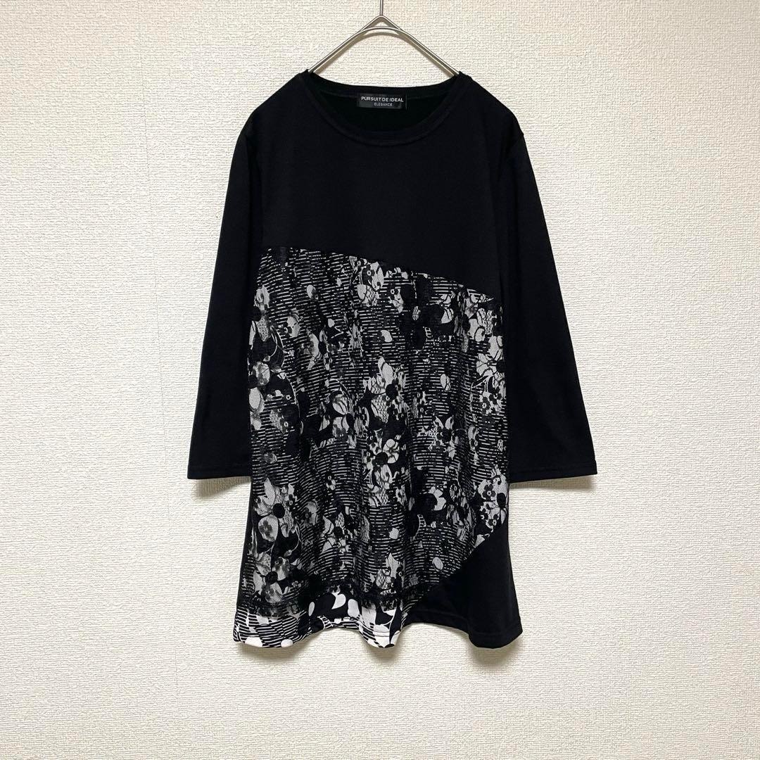 - qq177 カットソー/6分袖トップス/黒無地×プリントレース/モード/上品