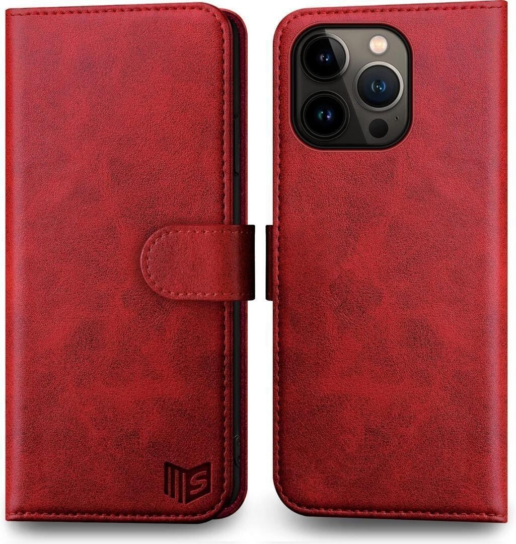 - iPhone 14 Pro Max 6.7インチ ケース 手帳型 ケース 本革 RFIDブロッキング カード収納 レッド