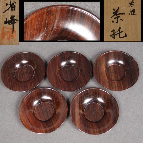 - 【金富士】木工芸作家物 省峰造 極上紫檀茶托5客 共箱 未使用 茶道具