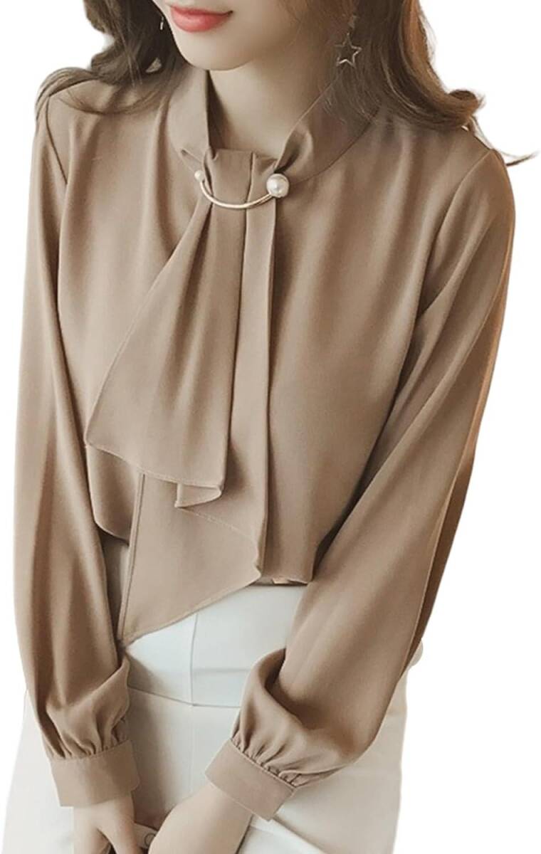 - レディース ブラウス 長袖 無地 クルーネック トップス (M, アプリコット)
