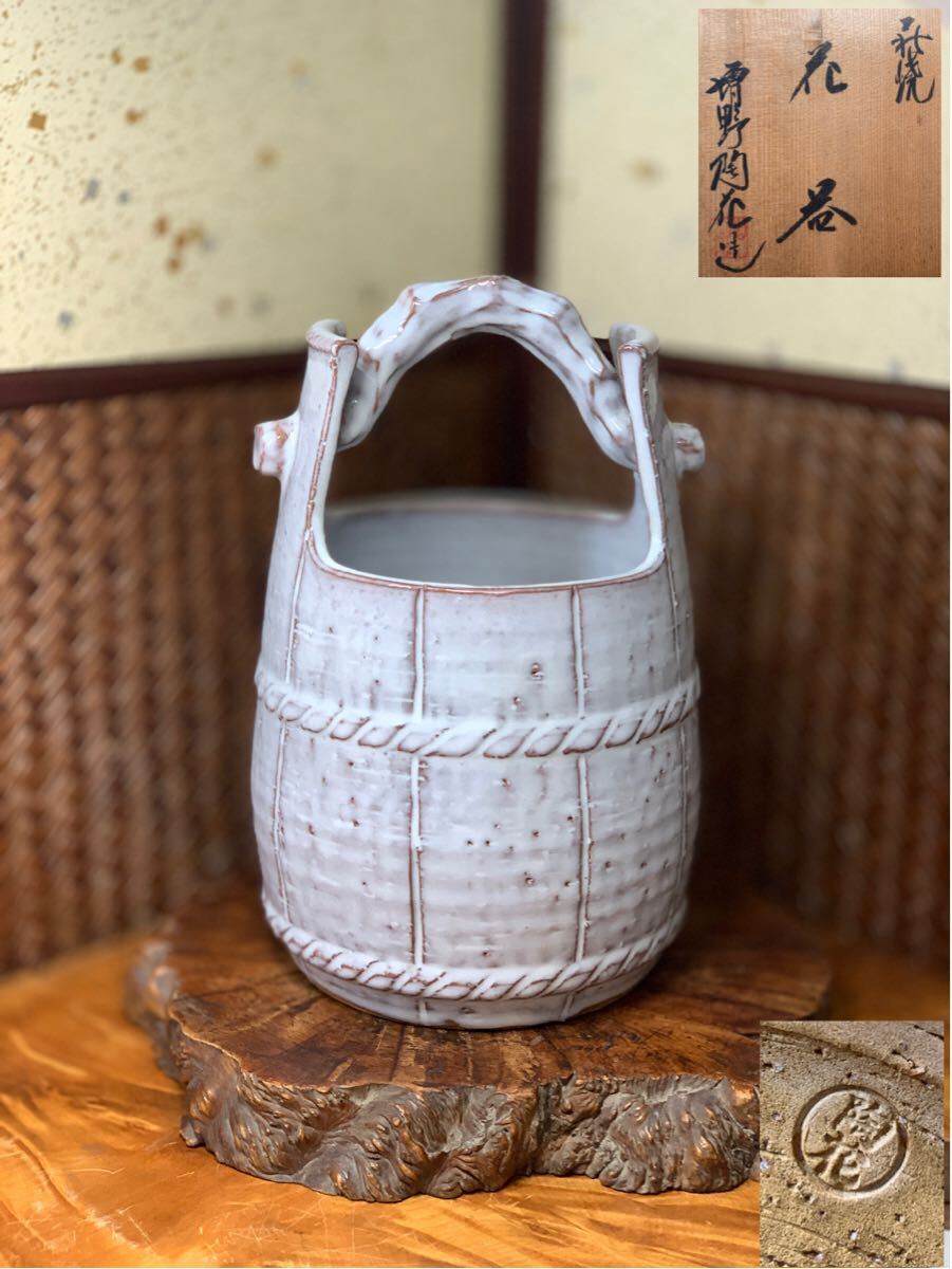 > 増野陶花 作 萩焼 手桶 花器 共箱 在銘 良品 陶印有 和美術 華道具 時代物 花入 茶道具 茶器 懐石道具 古道具 煎茶道具 骨董 古玩 茶器 萩
