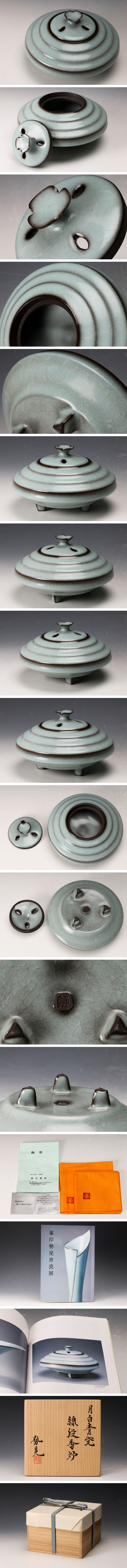 > 【佳香】峯岸勢晃 月白青瓷線段香炉 図録掲載作品 共箱 共布 栞 図録 茶道具 本物保証