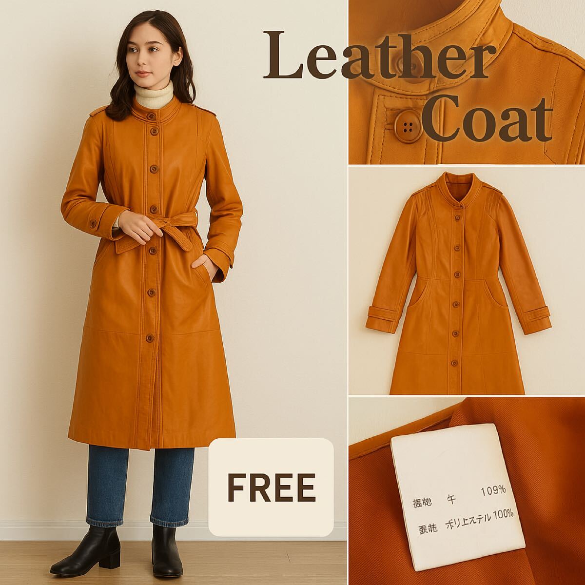 - 本革レザーコート キャメル系 FREEサイズ ミディ丈 牛革 裏地付き