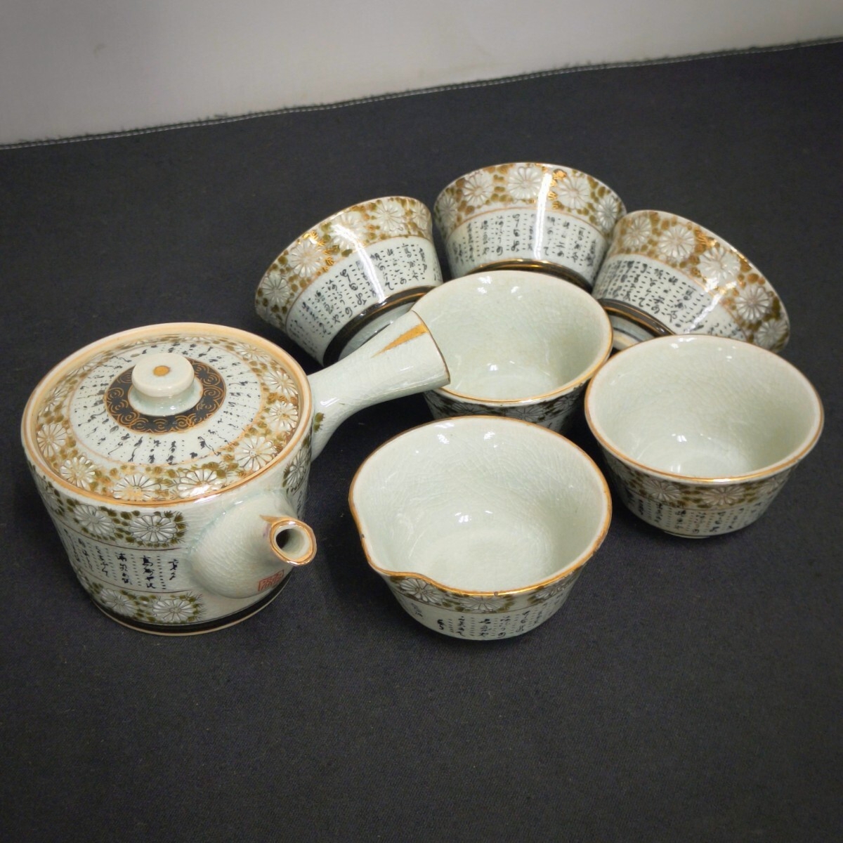 - 九谷焼 茶器揃 急須 湯冷まし 湯呑み 5客 金彩菊細字 煎茶道具 茶道具 茶器 金彩 (09257H
