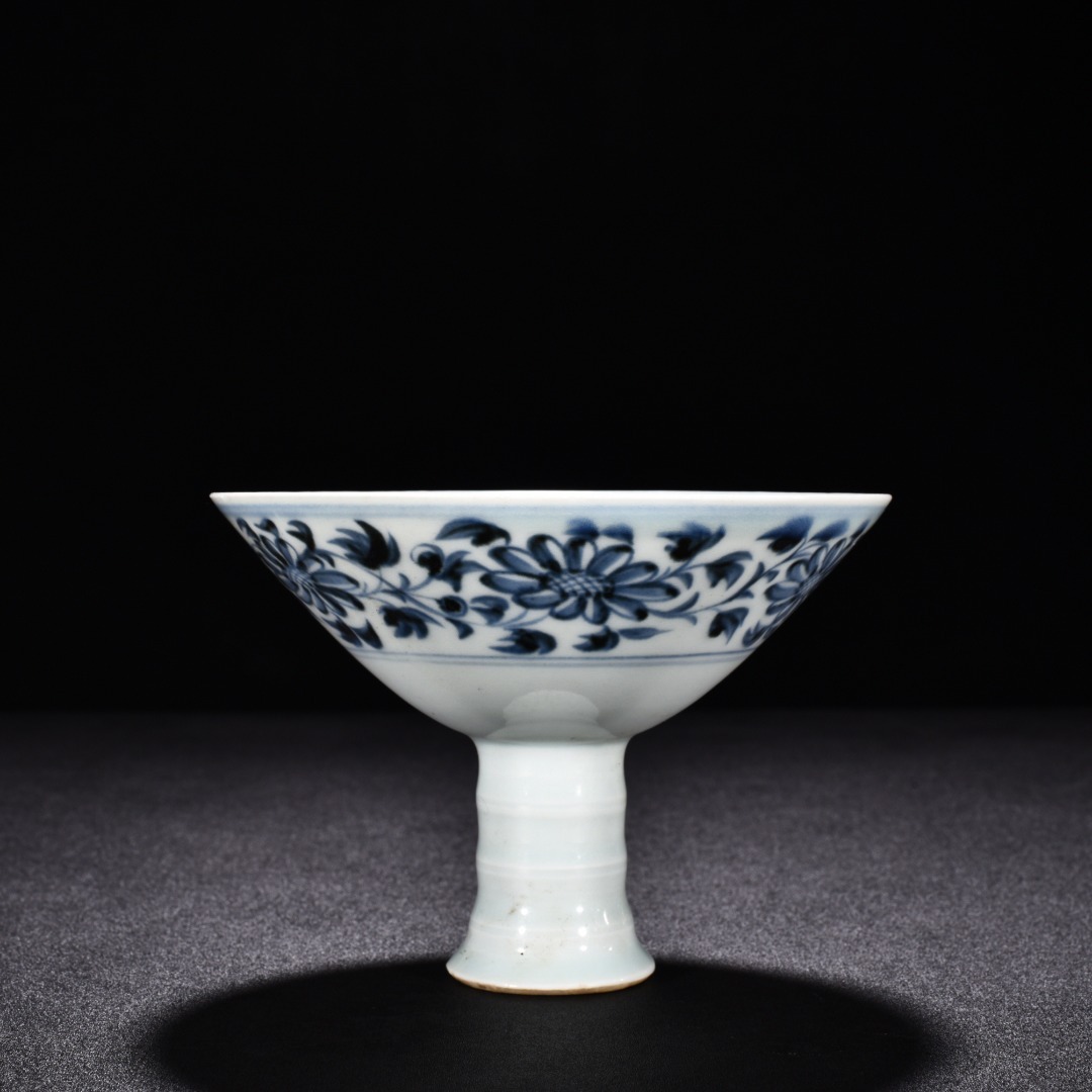 - 元時代 青花 染付 花卉文高足碗 唐物 箱付き 陶磁器 中国美術 古美術 置物 骨董品 高さ10cm 幅13.8cm HB262