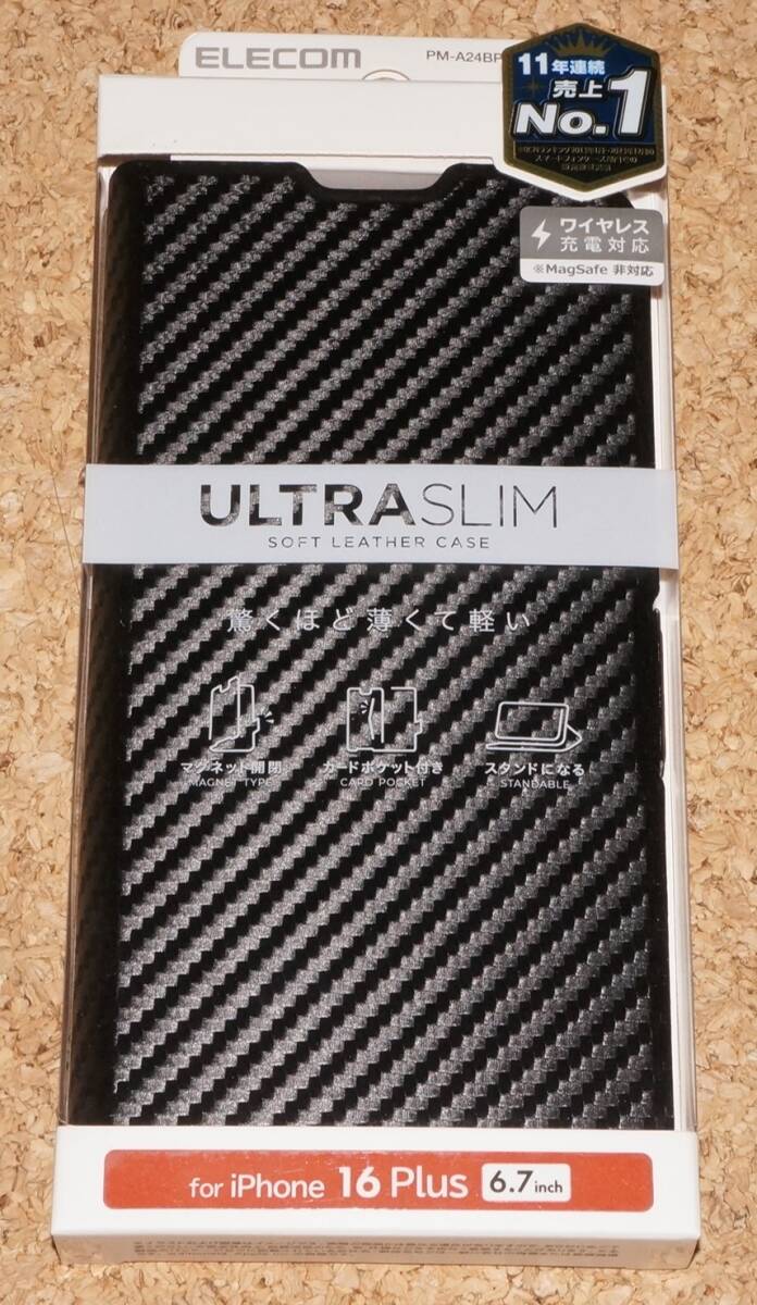 > ★新品★ELECOM iPhone16Plus レザーケース Ultra Slim カーボン調 ブラック