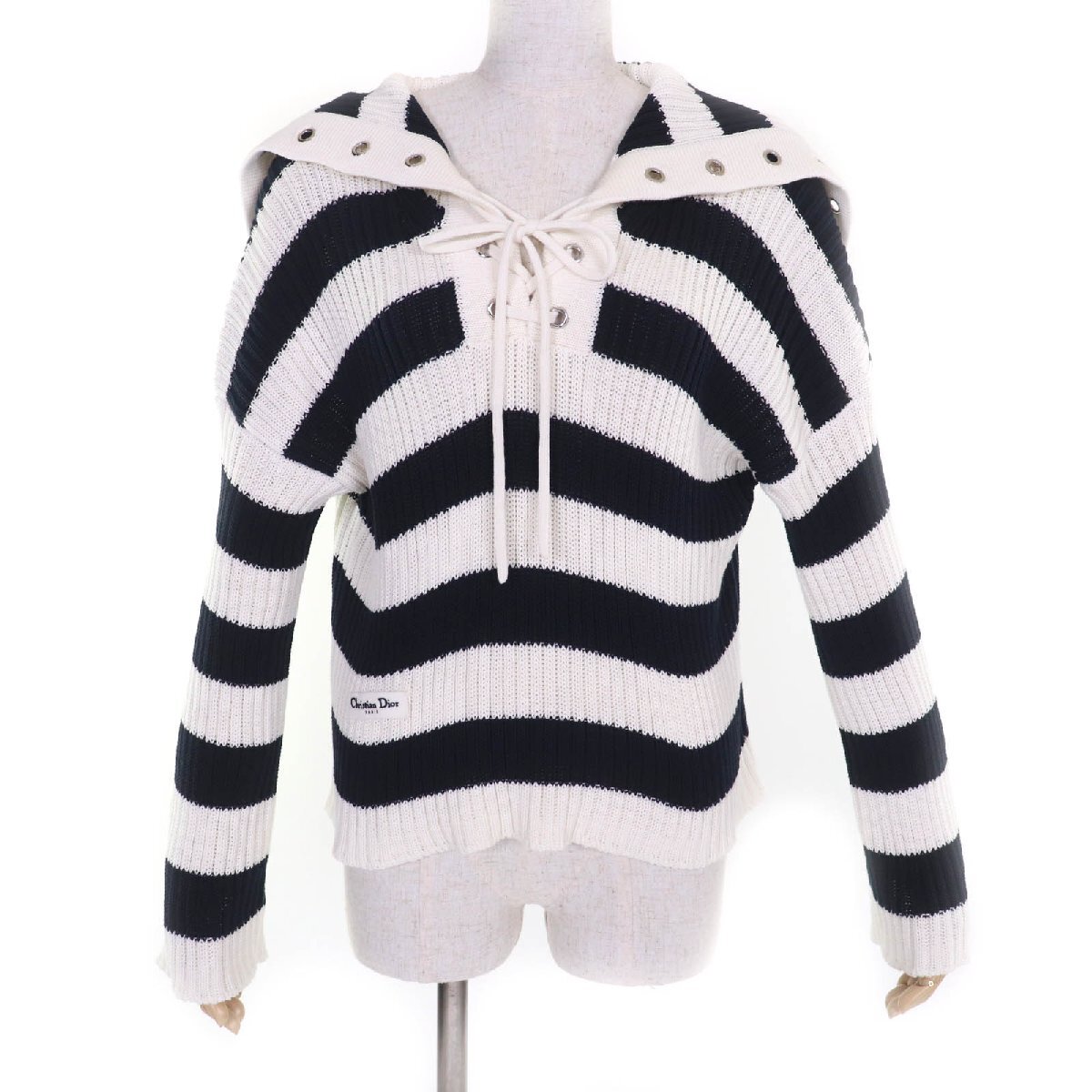 > 極美品★Christian Dior クリスチャンディオール 25SS 524S13A7025 コットン100% ボーダー セーラーカラー 長袖 ニット 白 ネイビー 40
