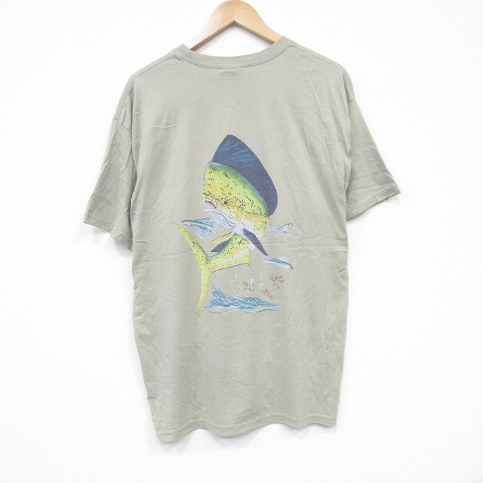 - L/古着 ヘインズ 半袖 ビンテージ Tシャツ メンズ 00s 魚 クルーネック 薄緑 グリーン 25sep24 中古