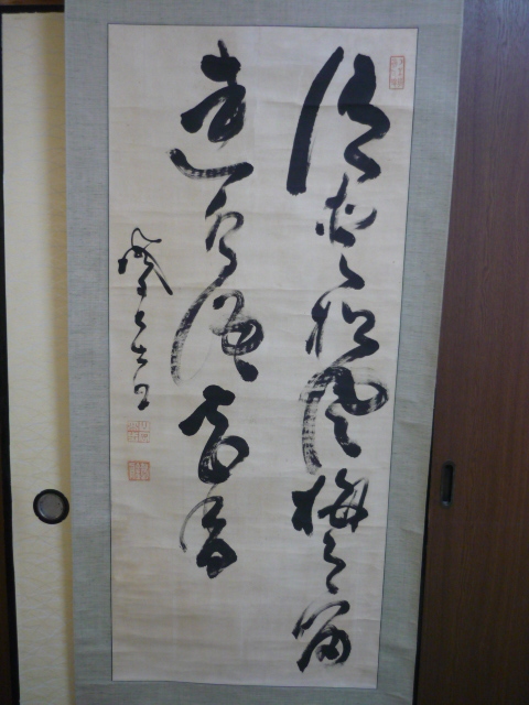- 【模写】 掛軸 山岡鉄舟 書 二行書 紙本 大きさ全体約199cmx70.5cm 紙本部分約129cmx55cm 合わせ箱あり