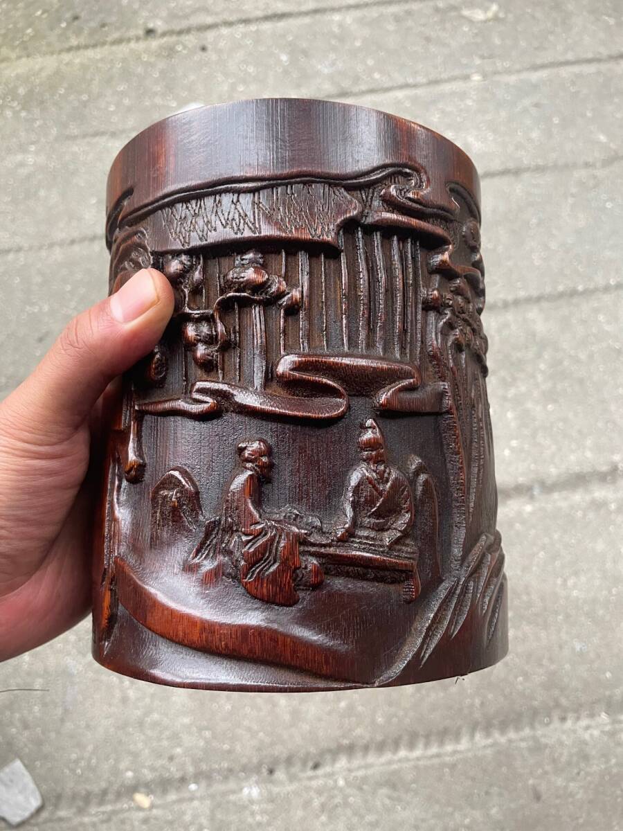 - 蔵友旧蔵出 竹材製 細密彫 乘舟訪友紋 文房筆筒 文房具 供養品 置物擺件 稀少珍藏品 古賞物 中国古玩 中国古美術品