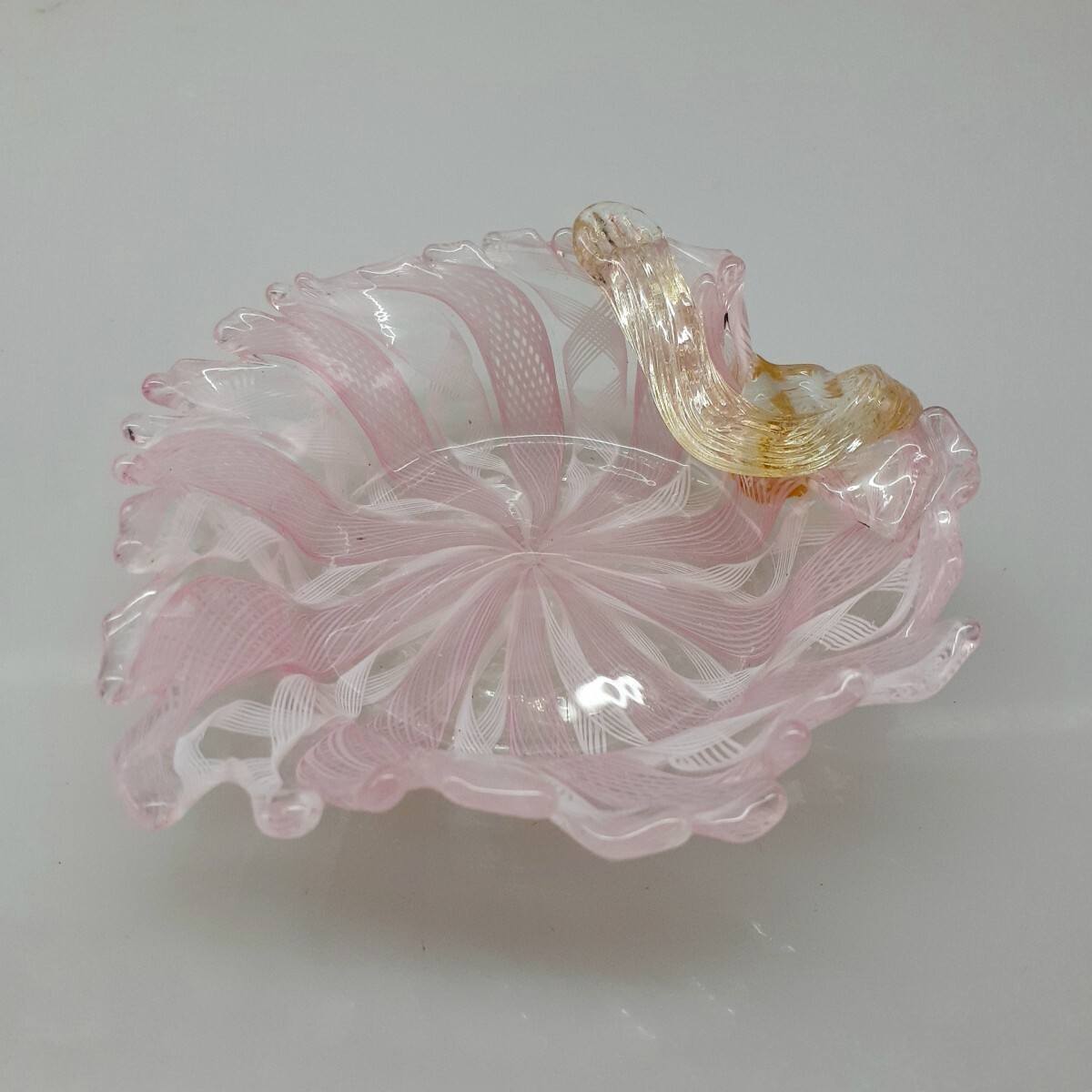 - 【MURANO】ITALY★ムラノ 金彩 木葉 モチーフ ピンク レース 皿★ヴェネチアン グラス ムラーノ 島 ベネチアン ガラス