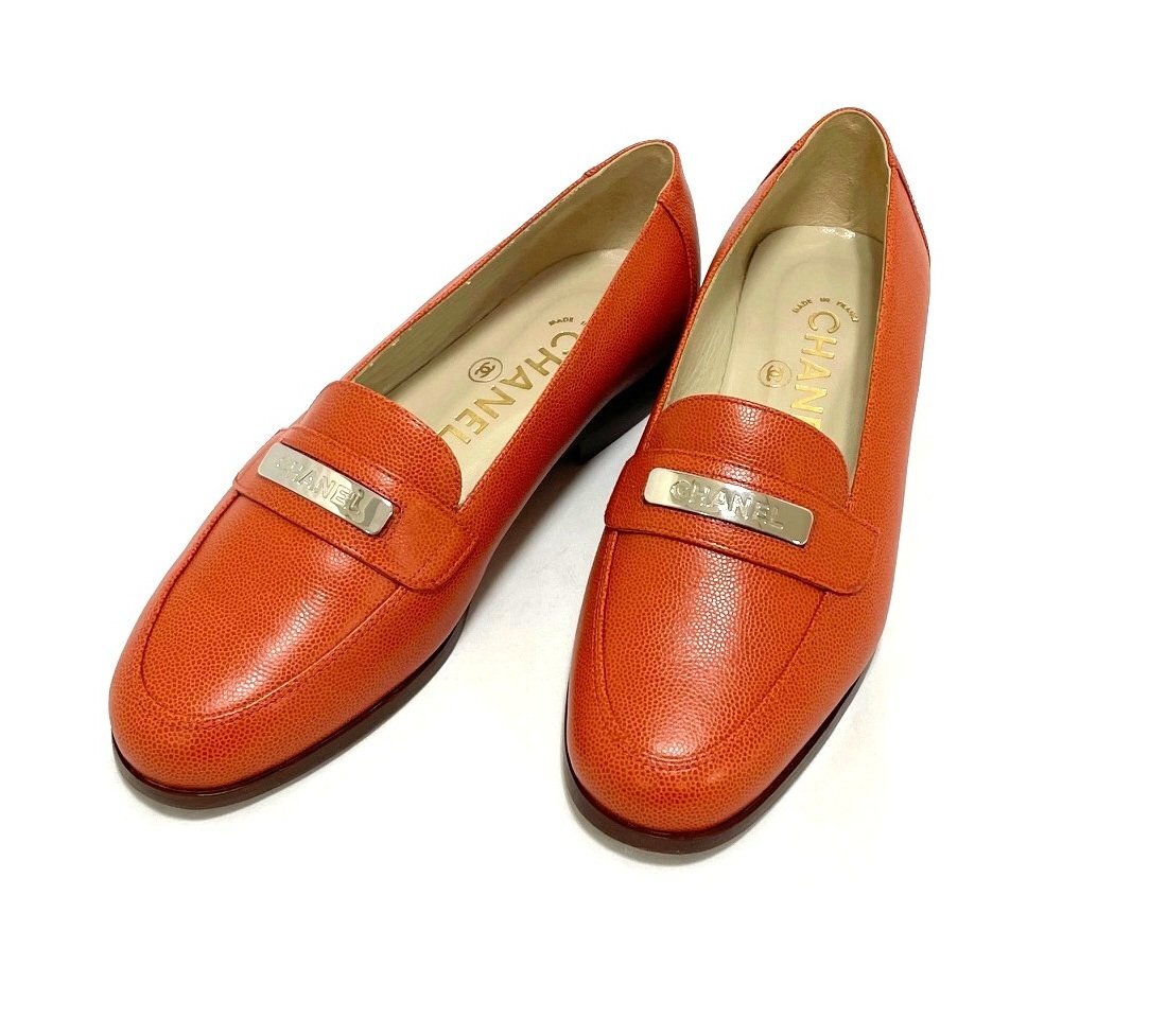 > CHANEL シャネル ロゴ プレート レザー ローファー サイズ 36 オレンジ × シルバー系金具 735 24489