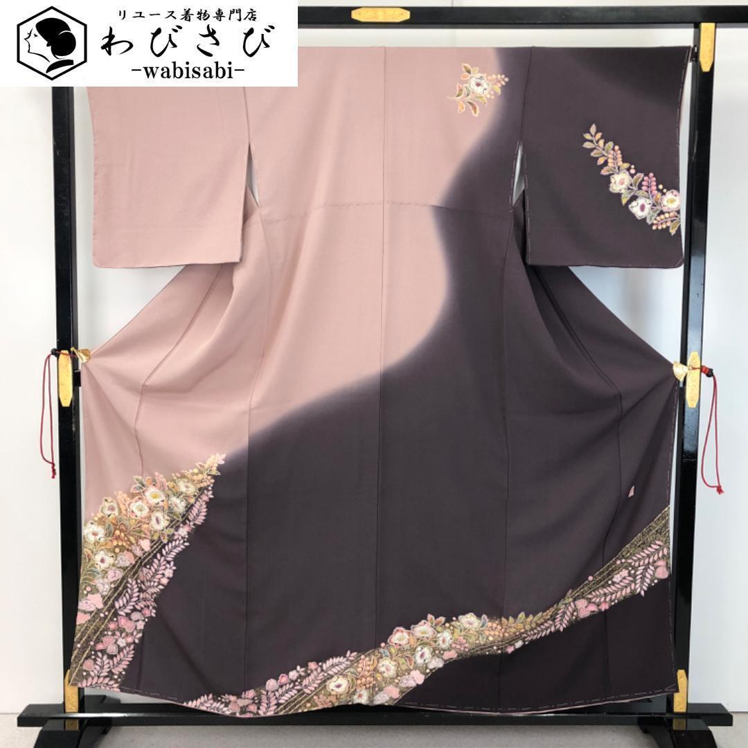 - 訪問着 桐谷翠山工房 美しい辻が花絞り 梅鼠色 しつけ糸 K-5296 着物 きもの kimono 和服 和装 中古 リサイクル着物 【送料無料】