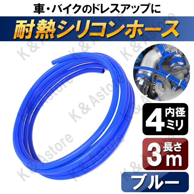 > 耐熱 シリコンホース 内径4mm 4ミリ バキュームホース ラジエターホース エンジンホース チューブ 汎用 車 バイク 外径9mm ブルー 全長3m