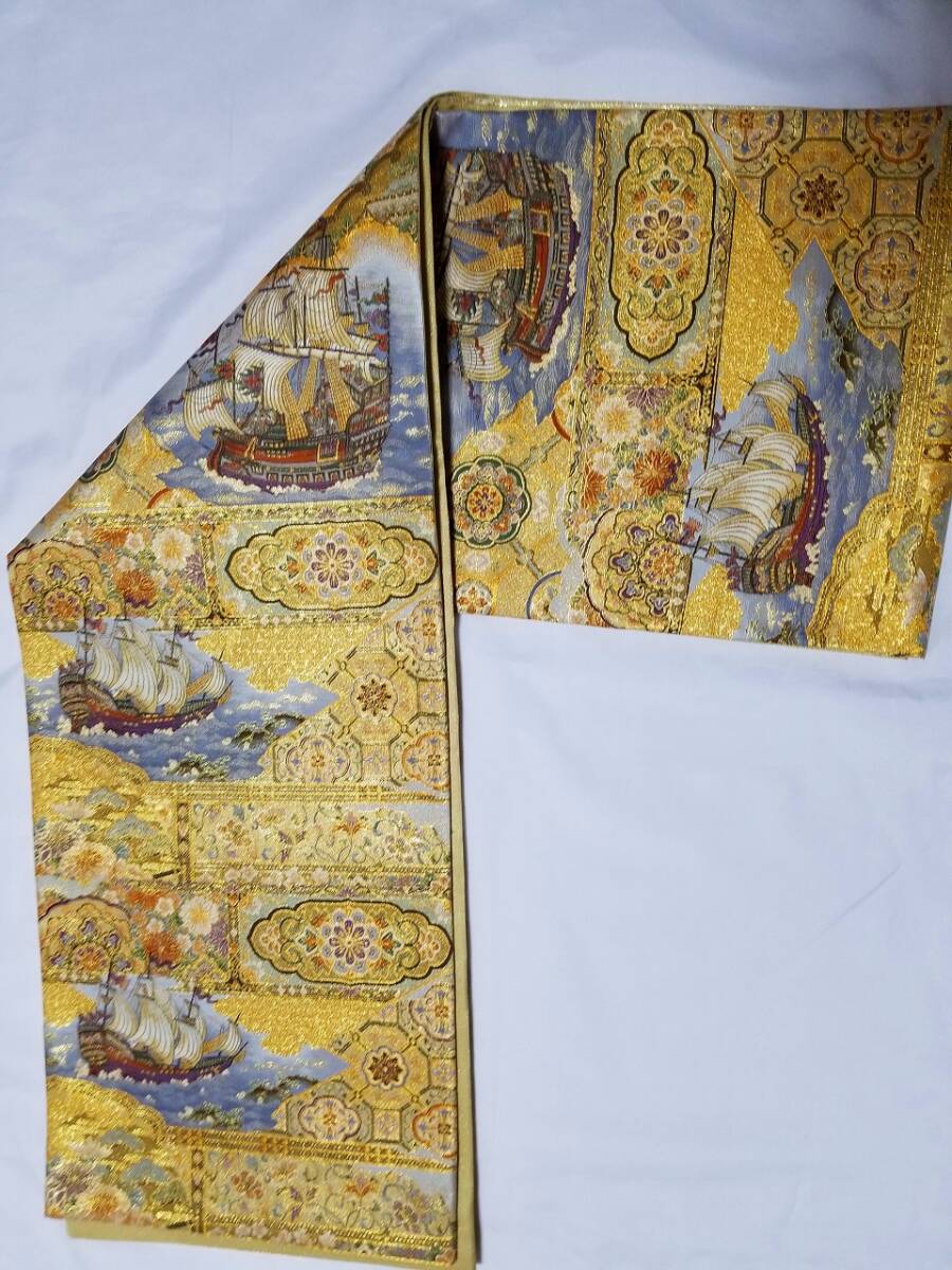 > 【桐輪】逸品袋帯☆送料無料{正絹*とみや織物*逸品*袋帯}*本金箔*招把織*古典吉祥.琳派文様と綴れ織風の帆船*六通柄*№4492