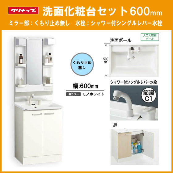 - 洗面化粧台セット(ミラー部くもり止めなし) シャワー付きシングルレバー水栓 幅:600mm BGAL60TNTVWJTS,M-L601GAEN クリナップ BGAシリーズ