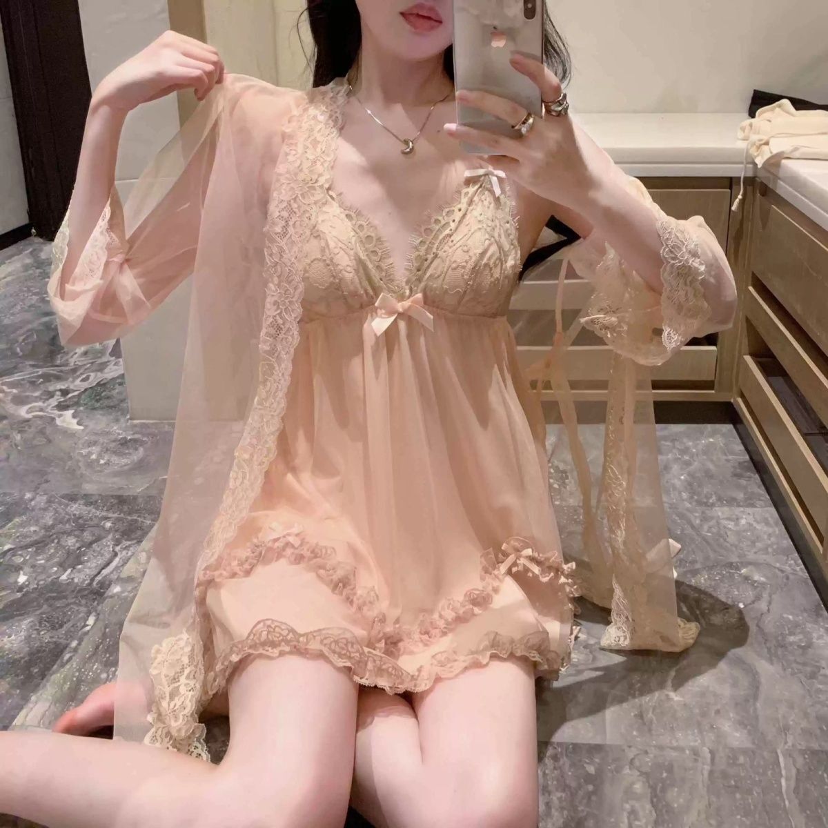 - 人気推薦 /大きいサイズ パッド付き ナイトドレス ゆったり 夏 薄手 セクシー レース 家居着 2点セット/ピンク