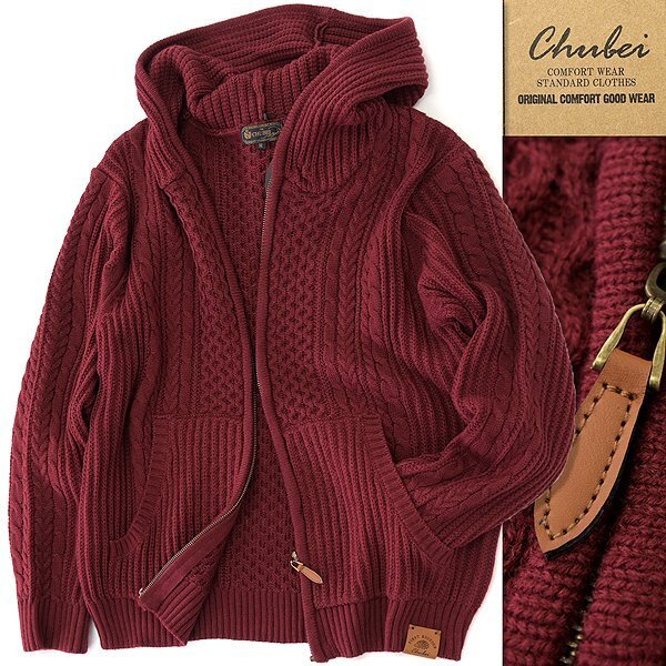 - 新品 チュウベイ フルジップ アラン ニット パーカー LL ワイン 【CH1444334_39_LL】 秋冬 CHUBEI ウール混 洗える ブルゾン フード