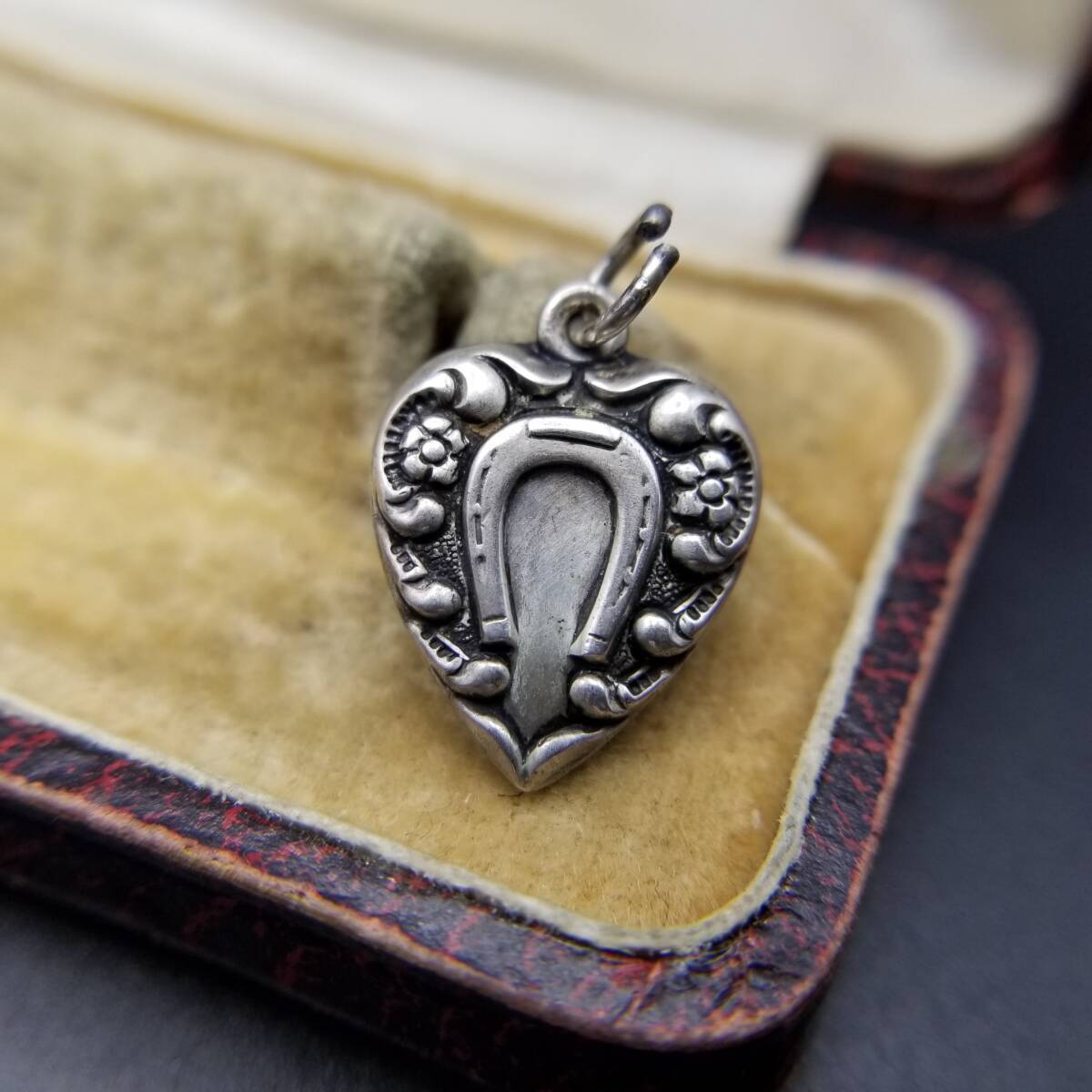 - WWII期 ヴィンテージ スウィートハートジュエリー ホースシューと勿忘草 925 シルバー チャーム ペンダント 銀 イニシャル彫金 GB Y23-L