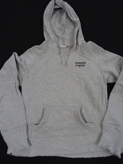 - TOMMY JEANS トミージーンズ パーカー スウェット かぶり フロントポケット ダメージ加工 グレー レディーストップス 春夏秋 Sサイズ