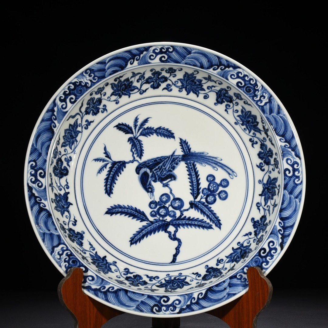 - 明時代 永樂 青花 染付 折枝 琵琶果文折沿盤 唐物 箱付き 陶磁器 中国美術 古美術 置物 骨董品 H36