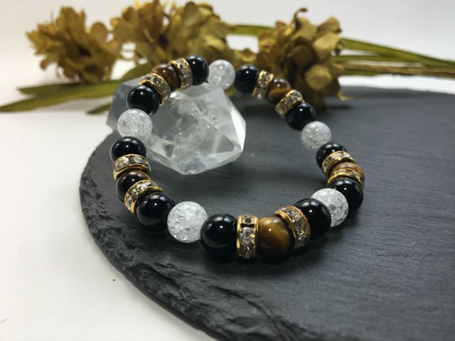 > タイガーアイ&オニキス&クラック水晶 パワーストーン ブレスレット 天然石ブレス (ゴールド) お守り 魔除け 効果 レディース ブラック 黒