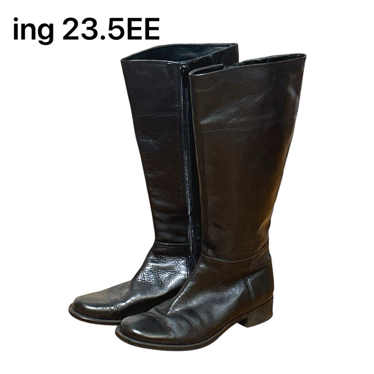 > Ing イング 本革 ロングブーツ 23.5cm EE(2E)幅広 黒 ブラック ゆったり履き口 日本製 レザー ローヒール YU