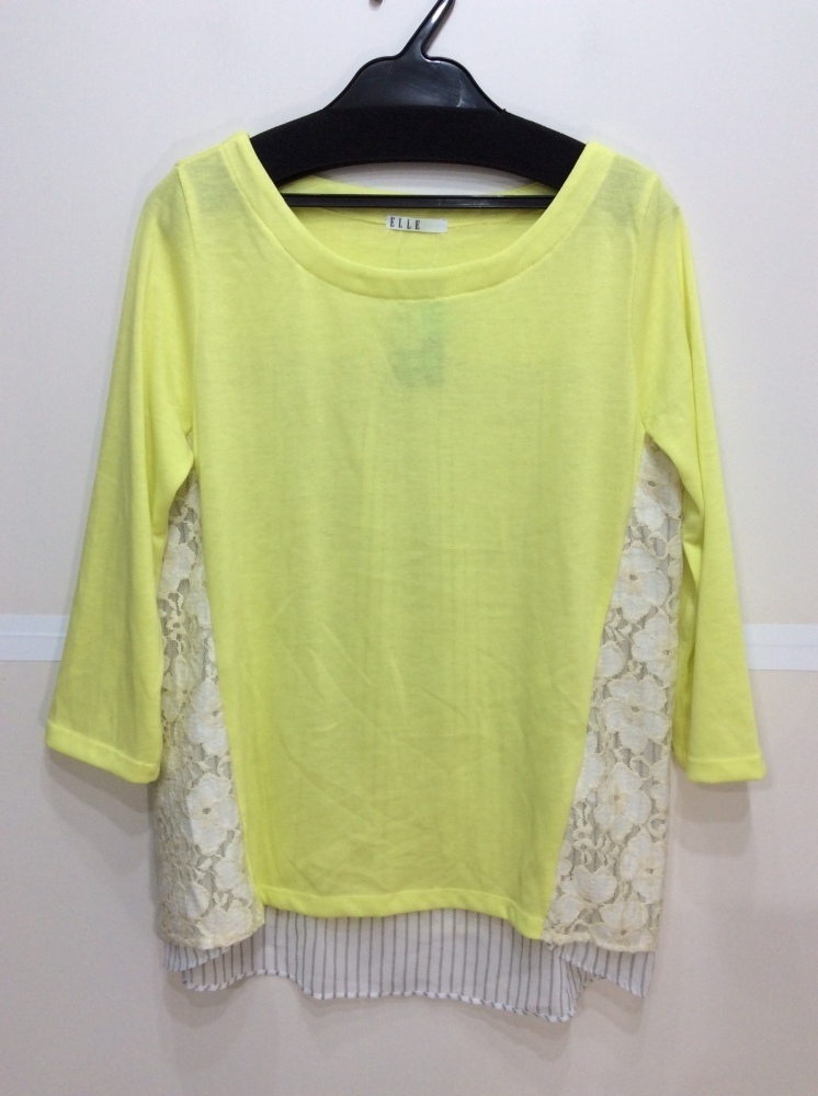 - エル 七分袖カットソー レモンイエロー色 後ろシースルーストライプ×レース花柄 サイズ38