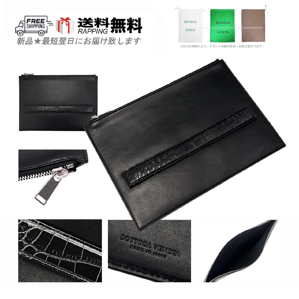 > L054.. BOTTEGA VENETA ボッテガ ヴェネタ クラッチバッグ BAG ドキュメント ケース リアルクロコ カーフ イタリア製 ★ 1000 BLACK