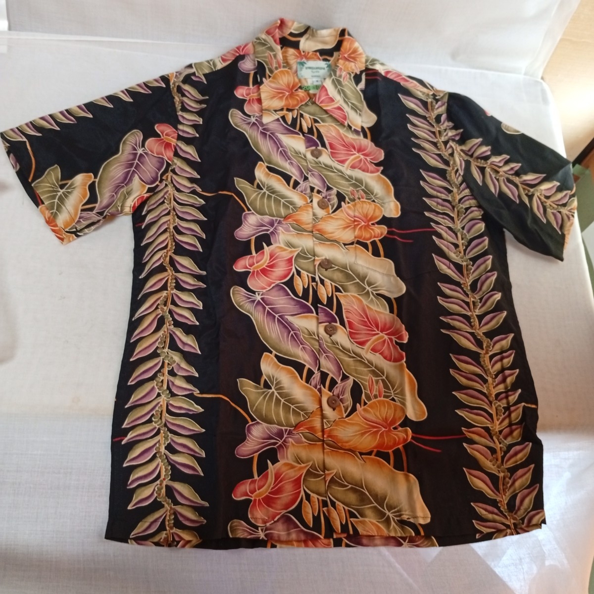 > か147 アロハシャツ カメハメハ KAMEHAMEHA Sサイズ アンスリウムオープンカラー 半袖 レーヨン ブラック 黒 レトロ コレクション