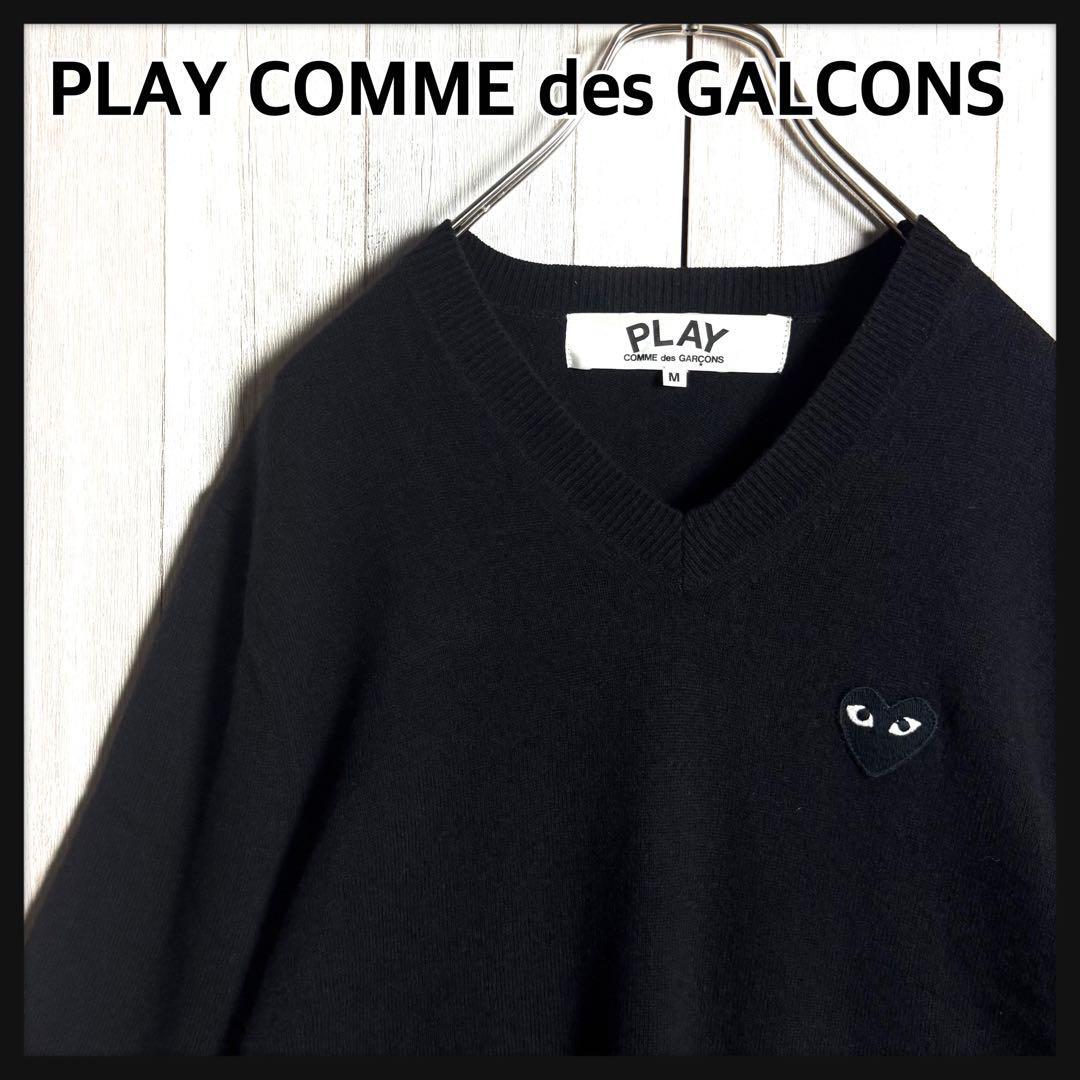 > 【希少人気デザイン・美品】PLAY COMME des GALCONS プレイコムデギャルソン ハートロゴ オールブラック Vネック ウール ニットセーター M
