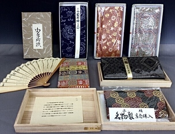 - 和装小物 8点 数珠入れ ふくさ 財布 表千家扇子 京念珠入 正絹 奄美大島紬 藍木綿 和柄 長財布 織物 伝統工芸 未使用品 中古品 管41018852